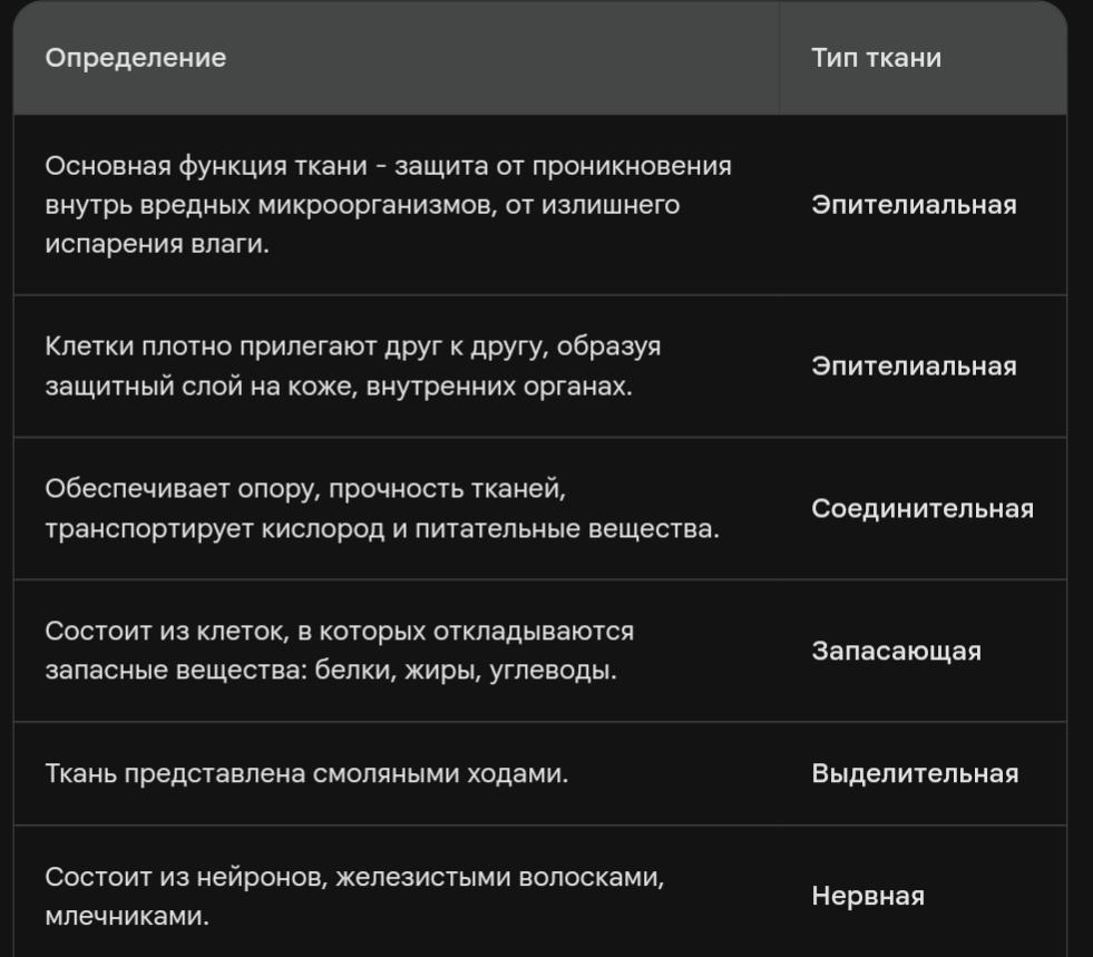 Задание 2. Подумай и распредели определение и типы тканей: Ткани Определение 1.Основная функция ткани. защита ОТ проникновения внутрь вредных микроорганизмов, от излишнего испарения влаги. 2.Клетки плотно прилегают друг к другу, образуя защитный слой на коже. внутренних органах. А.Нервная Б. Запасающая В. Выделительная Г.Покровная Д. Соединительная Г. Эпителиальная 3.Обеспечивает опору. прочность тканей, транспортирует кислород и питательные вещества. 4.Состоит из клеток, в которых откладываются запасные вещества: белки, жиры, углеводы. 5.Ткань представлена смоляными ходами. 6.Состоит из нейронов. железистыми волосками. млечниками.