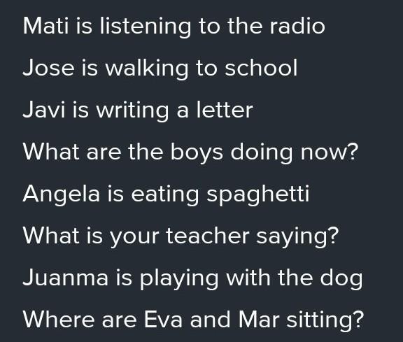 18. Mati 19. Jose 20. Javi 21. What . 22. Angela 23. What 24. Juanma 25. Where (listen) to the radio. (walk) to school. (write) a letter. the boys (eat) spaghetti. your teacher (play) with the dog. Eva and Mar (do) now? (say)? (sit)?