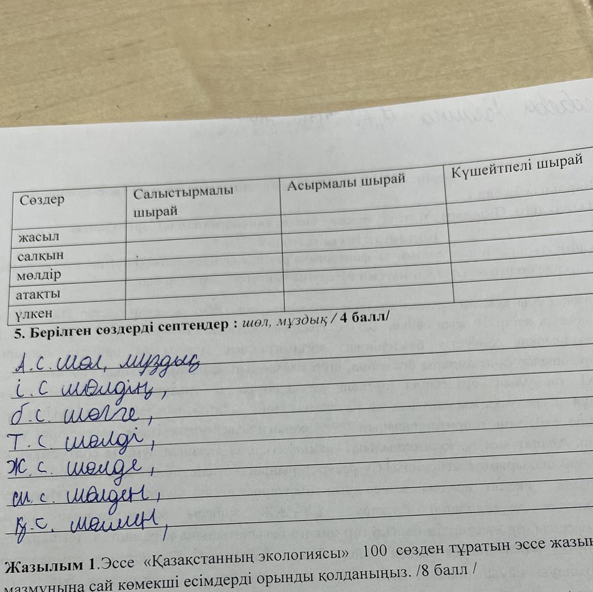 Күшейтпелі шырай: жап-жасыл, сап-салқын, мөп-мөлдір, ең атақты, үп-үлкен.