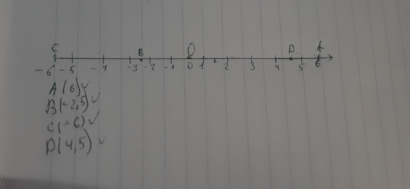 4. а) На координатной прямой отметьте точки А(6), B(-2,5), C(-6), D(4,5). 6) Укажите точки с противоположными координатами.