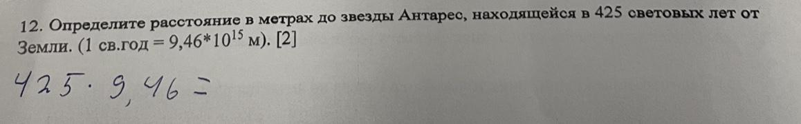 12. Определите расстояние в метрах до звезды Антарес, находящейся в 425 световых лет от Земли. (1 св.год = 9,46*1015 м).