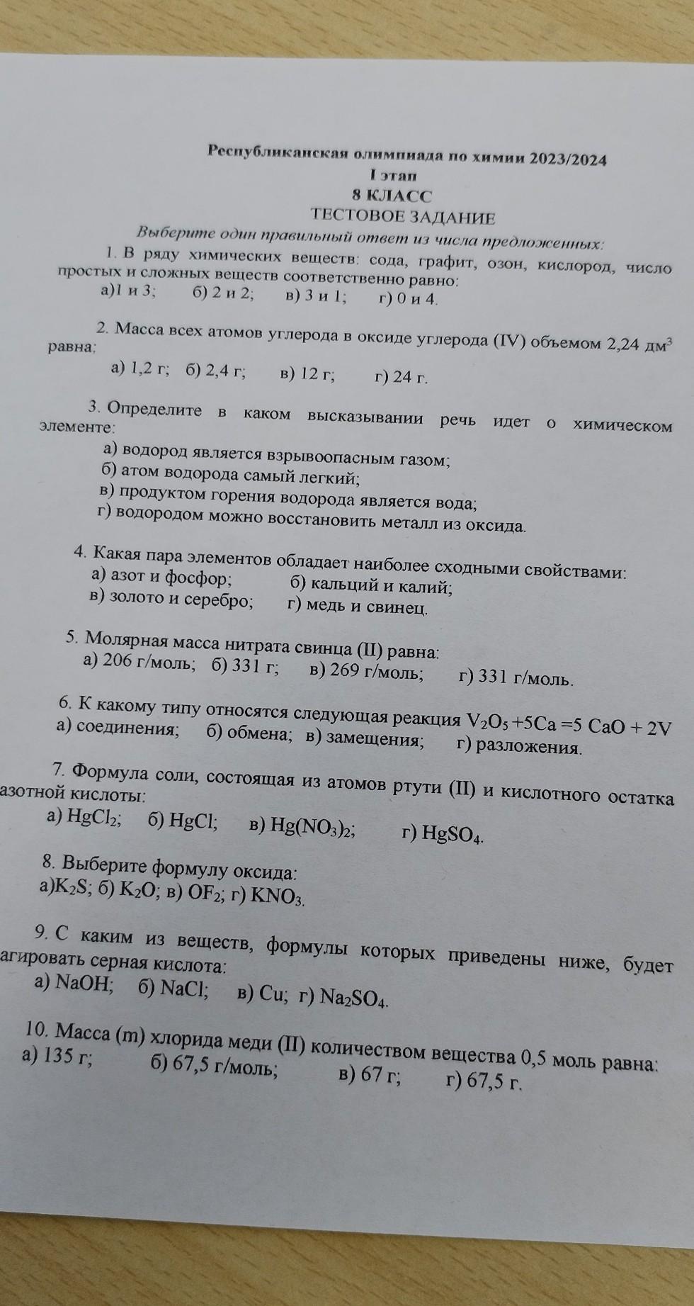 Республиканская олимпиада по химии 2023/2024 I этап 8 КЛАСС ТЕСТОВОЕ ЗАДАНИЕ помогите решить пожалуйста