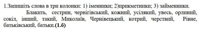1) Іменники: блакить, сокіл, миколаїв, рівне, батьки.