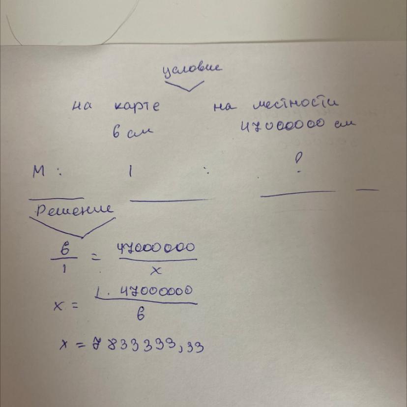 Масштаб = Расстояние на карте / Реальное расстояние = 6 см / 47000000 см = 1 / 7833333.33
