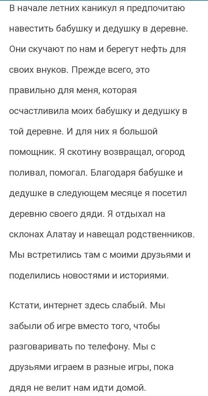 Ты просил меня рассказать о моих летних каникулах. Так вот, четвертого июля мы с семьей поехали в Турцию. Мы посетили несколько очень интересных городов, увидели летние украшения и праздничную иллюминацию на улицах. В Турции мы ели национальные блюда. Я также познакомилась с интересными людьми во время этой поездки и подружилась с некоторыми из них. Во время наших экскурсий по Стамбулу и другим городам, где мы посещали музеи и разные достопримечательности, я сделала много интересных фотографий. Я
