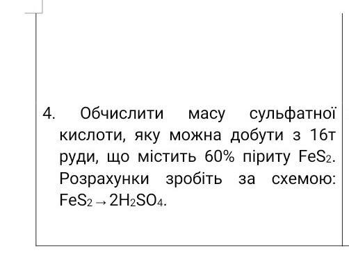 4. Обчислити масу сульфатно кислоти, яку можна добути з 161 руди, що містить 60% піриту FeS2 Розрахунки зробіть за за схемою FeS2 → 2H2SO4.