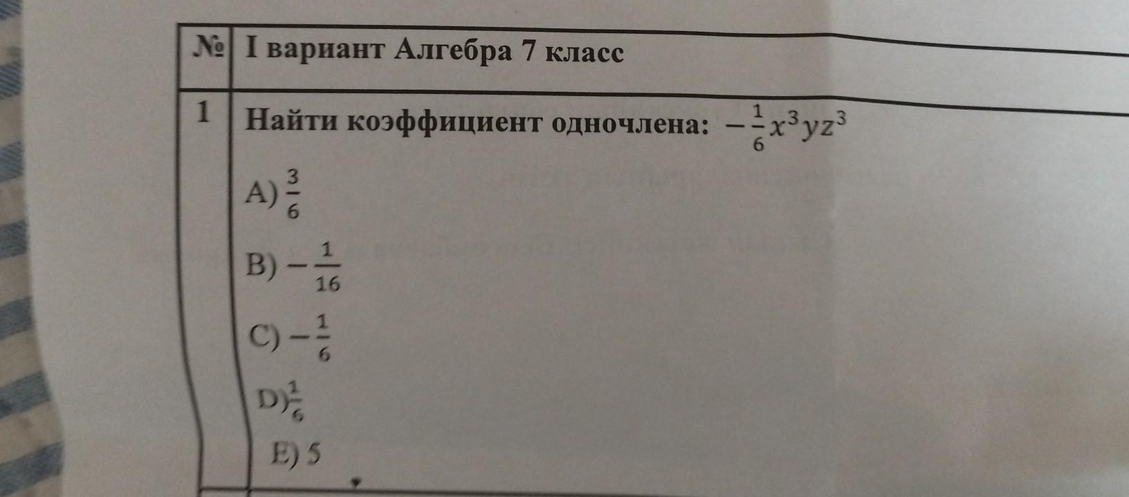 № I вариант Алгебра 7 класс 1 - Найти коэффициент одночлена: - x3yz³ A) 6 B) - 16 С) - D) E) 5 Балл 1