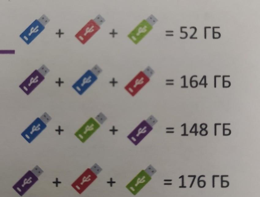 Найдите объём этой флешки если известны суммы объёмов флешек на рисунке. Одинаковые флешки имеют одинаковые объёмы, а разные флешки - разные объёмы.