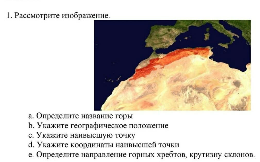 1. Рассмотрите изображение. а. Определите название горы b. Укажите географическое положение с. Укажите наивысшую точку d. Укажите координаты наивысшей точки е. Определите направление горных хребтов, крутизну склонов.
