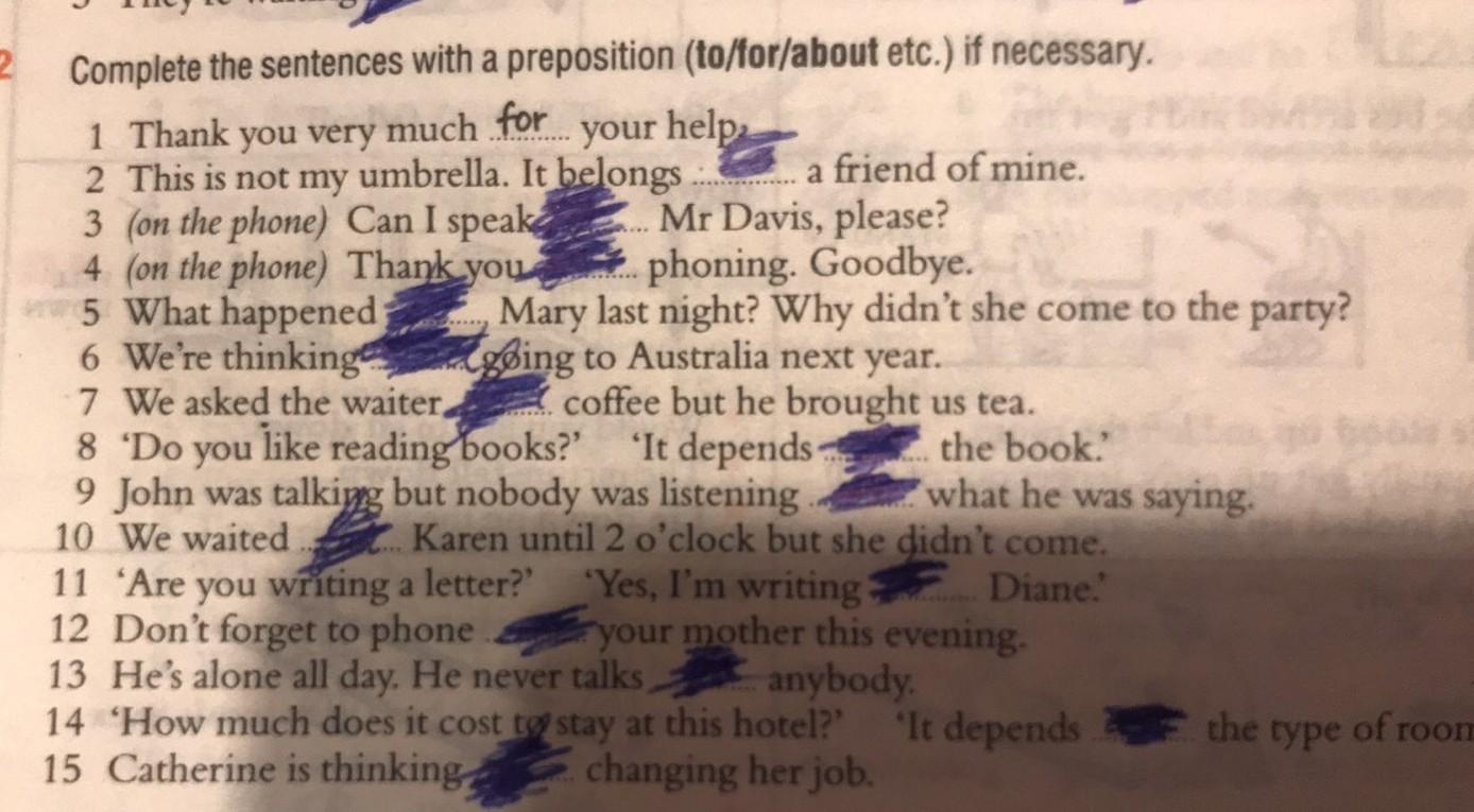 1 Thank you very much for your help, 2 This is not my umbrella. It belongs a friend of mine. 4 (on the phone) Thank you 3 (on the phone) Can I speak. Mr Davis, please? phoning. Goodbye. 5 What happened 6 We're thinking 7 We asked the waiter, coffee but he brought us tea. 8 'Do you like reading books?' 'It depends the book." 9 John was talking but nobody was listening.. 10 We waited... Karen until 2 o'clock but she didn't come. 11 'Are you writing a letter?' 'Yes, I'm writing. Diane.' 12 Don't forget to phone your mother this evening. anybody. 13 He's alone all day. He never talks 14 'How much does it cost to stay at this hotel?' 'It depends 15 Catherine is thinking changing her job. Mary last night? Why didn't she come to the party? going to Australia next year. what he was saying. SH the type of room."