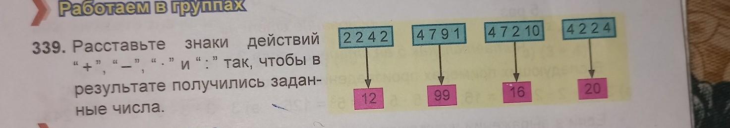 знаки действий .. -" и ":" так, чтобы в 339. Расставьте результате получились задан- ные числа. 2242 12 4791 99 472 10 16 4224 20