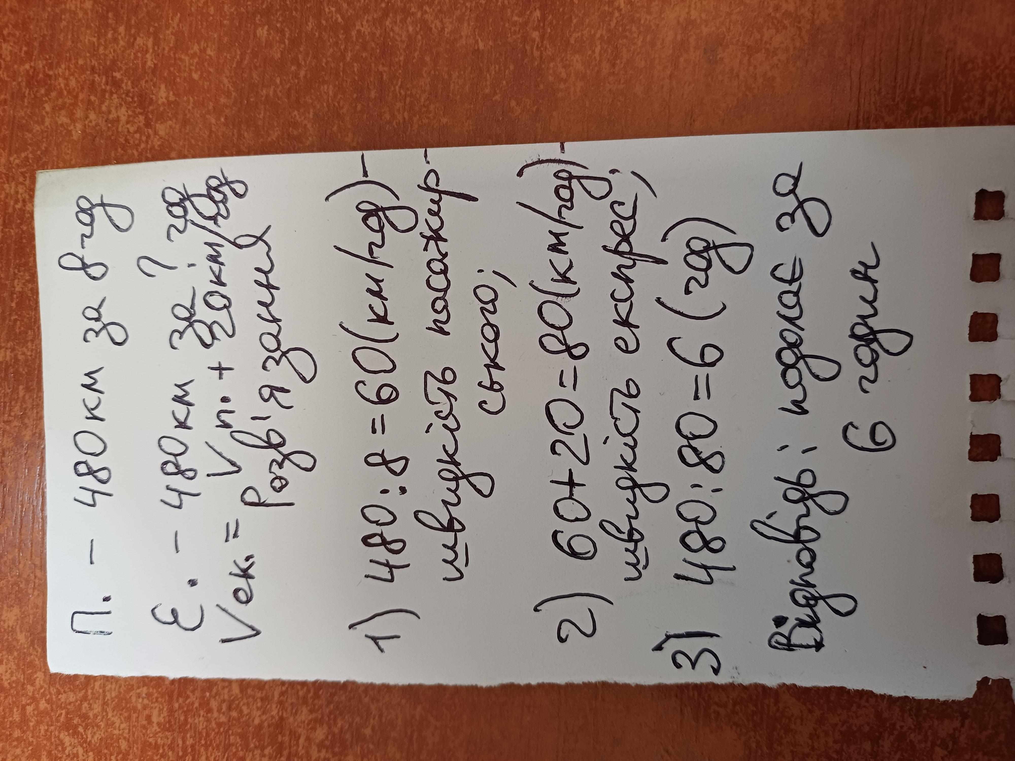 Пасажирський поїзд долає 480 кілометрів за 8 годин за скільки години подолає цю саму відстань експрес швидкість якого на 20 км/год більша за швидкість пасажирського поїзда