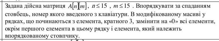 Цей код спочатку вводить розмірність матриці та номер стовпця для впорядкування. Потім вводяться елементи матриці. Потім виконується впорядкування стовпця за спаданням. Нарешті, у рядках, що починаються з елемента, кратного 3, замінюються на «0» всі елементи, окрім першого елемента в цьому рядку і елемента, який належить впорядкованому стовпчику. Модифікована матриця потім виводиться на екран. Зверніть увагу, що цей код не має обробки помилок і припускає, що вхідні дані завжди коректні.
