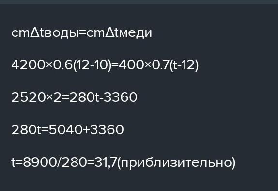 воду масою 600 г, температура якої становить 10 = c занурили мідне тіло масою 0,7 кг. Після встановлення теплової рівноваги температура дорівнює 12 = C Визнач по- чаткову температуру тіла. Теплообміном із навколишнім середовищем знехтуй.