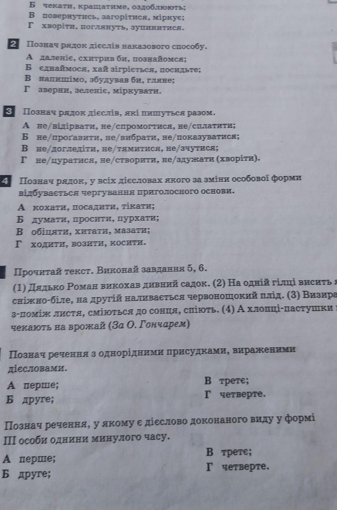 А не/відірвати, не/спромогтися, не/сплатити; Б не прогавити, не/вибрати, не/показуватися; В не/догледіти, не/тямитися, не/зчутися; Г не цуратися, не/створити, не/здужати (хворіти). Познач рядок, у всіх дієсловах якого за зміни особової форми відбувається чергування приголосного основи. А кохати, посадити, тікати; Б думати, просити, пурхати; В обіцяти, хитати, мазати; Г ходити, возити, косити. Прочитай текст. Виконай завдання 5, 6. (1) Дядько Роман викохав дивний садок. (2) На одній гілці виси сніжно-біле, на другій наливається червонощокий плід. (3) Виз з-поміж листя, сміються до сонця, спiють. (4) А хлопці-пастуш чекають на врожай (За О. Гончарем) Познач речення з однорідними присудками, вираженими пiєсловами. А перше; 5 Друге; В трете; Г четверте. Познач речення, у якому є дієслово доконаного виду у формі II особи однини минулого часу. перше: Друге; В трете; Г четверте.