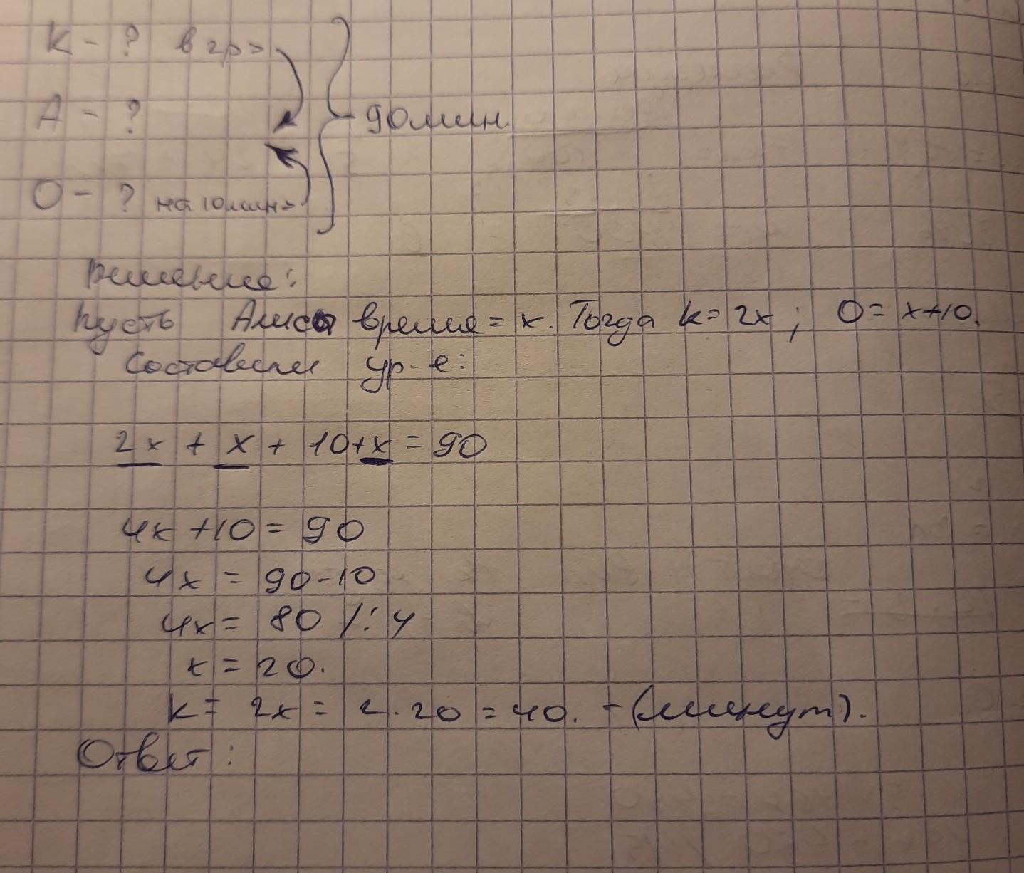 Оле на уборку требуется на 10 минут больше, чем Алисе. В общей сложности они тратят 90 минут на уборку своих комнат. Сколько времени нужно Кате, чтобы убрать свою комнату?