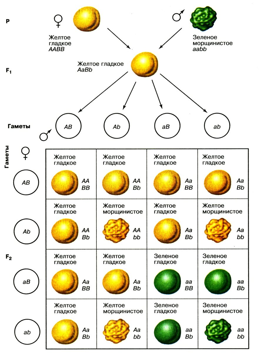. У гороха жёлтый цвет семян (А) доминирует над зелёным (а), гладкая поверхность семян (В) - над морщинистой (b). Гомозиготный жёлтый гладкий горох скрещивали с зелёным морщинистым. определите фенотипы и генотипы потомства в первом и во втором поколениях