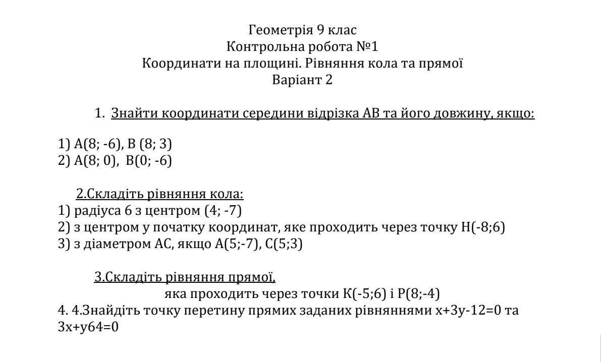 Геометрія 9 клас Контрольна робота №1 Координати на площині. Рівняння кола та прямої Варіант 2 1. Знайти координати середини відрізка AB та його довжину, якщо: 1) A(8; -6), В (8; 3) 2) A(8; 0), B(0; -6) 2.Складіть рівняння кола: 1) радіуса 6 з центром (4; -7) 2) з центром у початку координат, яке проходить через точку Н(-8;6) 3) з діаметром АС, якщо А(5;-7), C(5;3) 3.Складіть рівняння прямої, яка проходить через точки К(-5;6) i P(8;-4) 4. 4.Знайдіть точку перетину прямих заданих рівняннями x+3y-12=0 та 3x+y64=0