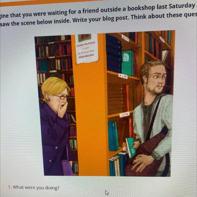 Imagine that you were waiting for a friend outside a bookshop last Saturday and that you saw the scene below inside.What your blog post.Think about these questions.СРОЧНО ОЧЕНЬ ДА 50 БАЛОВ!!!!