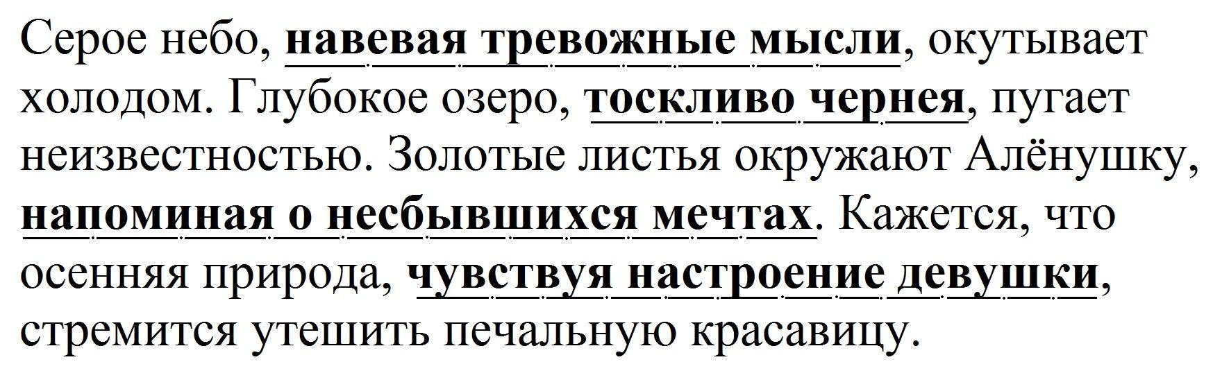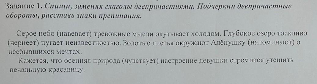 Задание 1. Спищи, заменяя глаголы деепричастиями. Подчеркни деепричастные обороты, расставь знаки препинания. Серое небо (навевает) тревожные мысли окутывает холодом. Глубокое озеро тоскливо (чернеет) пугает неизвестностью. Золотые листья окружают Алёнушку (напоминают) о несбывшихся мечтах. Кажется, что осенняя природа (чувствует) настроение девушки стремится утешить печальную красавицу
