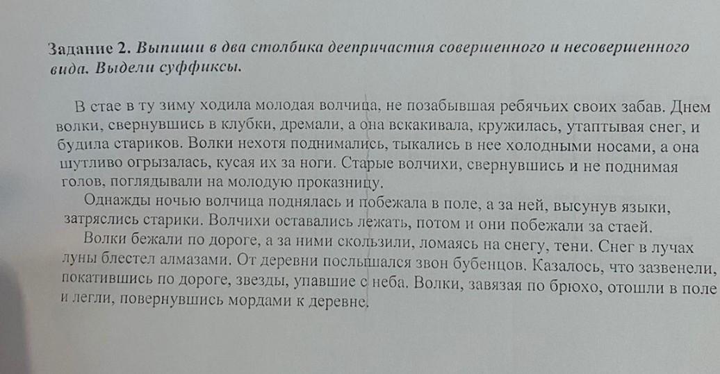 Задание 2. Выпиши в два столбика деепричастия совершенного и несовершенного вида. Выдели суффиксы. В стае в ту зиму ходила молодая волчица, не позабывшая ребячьих своих забав. Днем волки, свернувшись в клубки, дремали, а она вскакивала, кружилась, утаптывая снег, и будила стариков. Волки нехотя поднимались, тыкались в нее холодными носами, а она шутливо огрызалась, кусая их за ноги. Старые волчихи, свернувшись и не поднимая голов, поглядывали на молодую проказницу. Однажды ночью волчица поднялась и побежала в поле, а за ней, высунув языки, затряслись старики. Волчихи оставались лежать, потом и они побежали за стаей. Волки бежали по дороге, а за ними скользили, ломаясь на снегу, тени. Снег в лучах луны блестел алмазами. От деревни послышался звон бубенцов. Казалось, что зазвенели, покатившись по дороге, звезды, упавшие с неба. Волки, завязая по брюхо, отошли в поле и легли, повернувшись мордами к деревне.