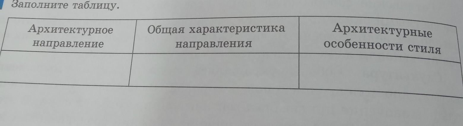 Заполните таблицу. Архитектурное направление Общая характеристика направления Архитектурные особенности стиля