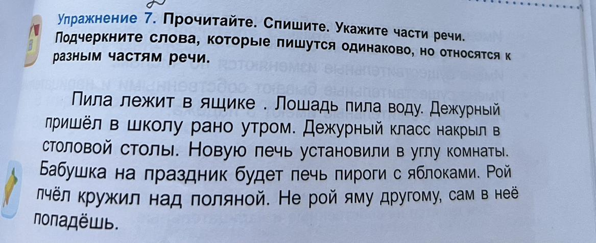 ПИЛА лежит в ящике (пила вещь которая рубит деревья).Лошадь ПИЛА воду (пьет). ДЕЖУРНЫЙ пришел в школу рано утром (дежурит). ДЕЖУРНЫЙ класс накрыл столовой столы (класс который дежурит).новую ПЕЧЬ установили в углу комнаты (печь на которой готовят еду).бабушка на праздник будет ПЕЧЬ пироги с яблоками (печь чтобы поесть ).РОЙ пчел кружил поляной (толпа пчел ).Не РОЙ яму другому ,сам в нее упадешь (рыть яму -копать яму