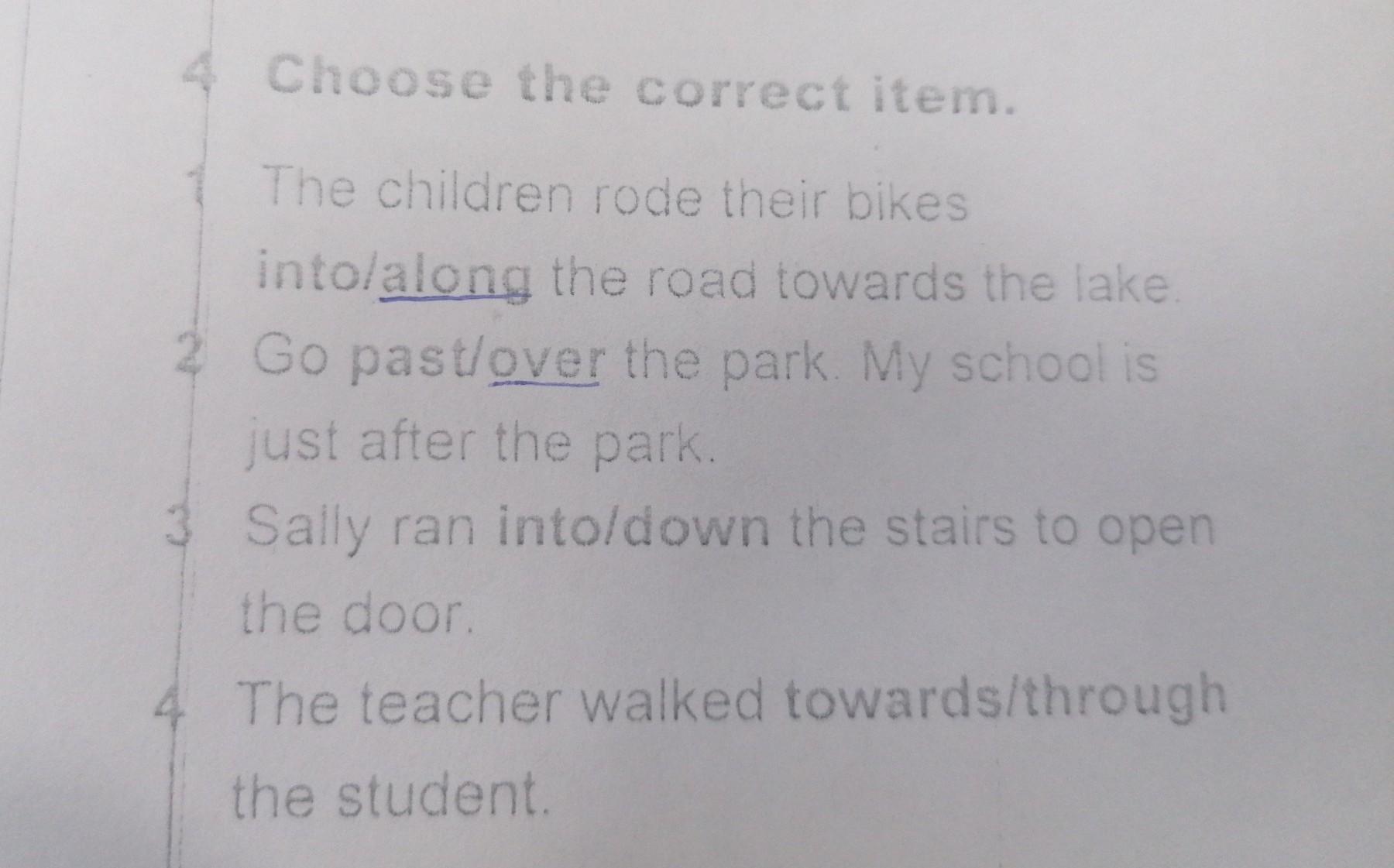 4. Choose the correct item. 1. The children rode their bikes into/along the road towardsvthe lake.