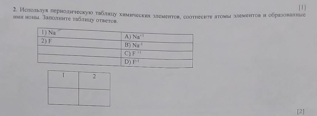 2. Используя периодическую таблицу химических элементов, соотнесите атомы элементов и образованные ими ионы. Заполните таблицу ответов. 1) Na 2) F 2 A) Na B) Na C) F +1 D) FI [2]