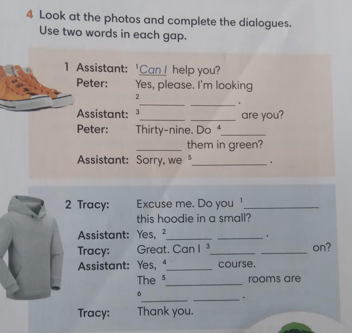 1 Assistant: 'Can I help you? Peter: Yes, please. I'm looking 2 Assistant: Peter: Thirty-nine. Do 4 3 Assistant: Sorry, we Tracy: Assistant: Tracy: Assistant: Yes, 4 The 5 6 2 Tracy: Excuse me. Do you 1 this hoodie in a small? Yes, 2 Great. Can I 3 are you? them in green? Thank you. course. rooms are on?