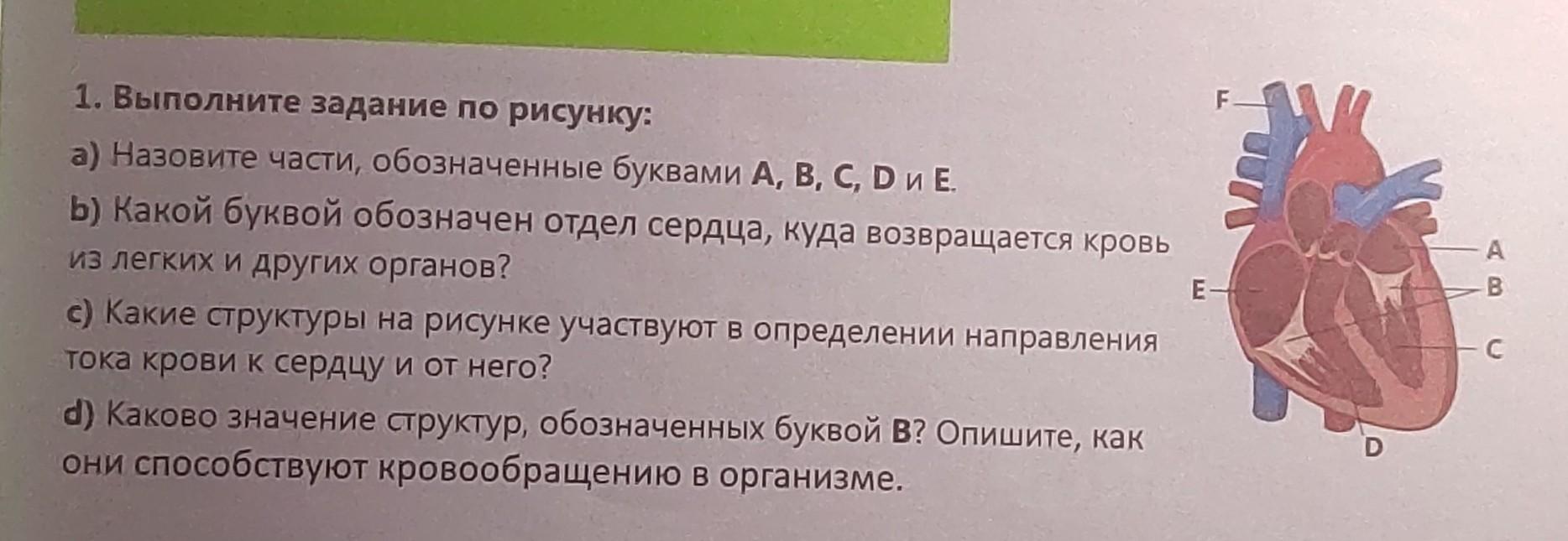 1. Выполните задание по рисунку: а) Назовите части, обозначенные буквами А, B, C, D и E. b) Какой буквой обозначен отдел сердца, куда возвращается кровь из легких и других органов? с) Какие структуры на рисунке участвуют в определении направления тока крови к сердцу и от него? d) Каково значение структур, обозначенных буквой В? Опишите, как они способствуют кровообращению в организме.