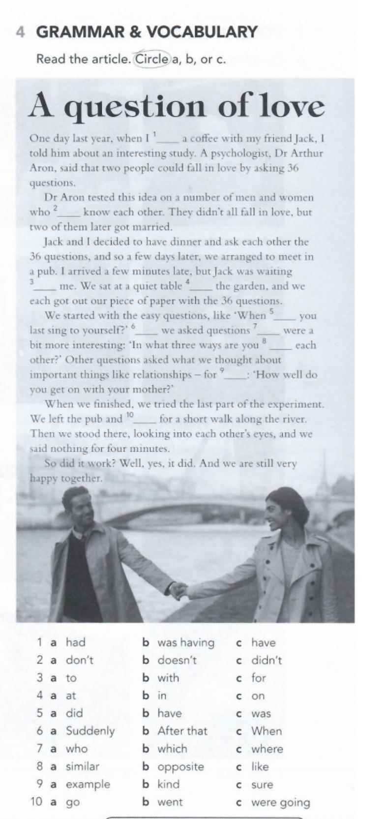 4 GRAMMAR & VOCABULARY Read the article. Circle a, b, or c. A question of love 1 One day last year, when I a coffee with my friend Jack, I told him about an interesting study. A psychologist, Dr Arthur Aron, said that two people could fall in love by asking 36 questions. Dr Aron tested this idea on a number of men and women who 2 know each other. They didn't all fall in love, but two of them later got married. Jack and I decided to have dinner and ask each other the 36 questions, and so a few days later, we arranged to meet in a pub. I arrived a few minutes late, but Jack was waiting me. We sat at a quiet table 3 4 5 6 7 the garden, and we each got out our piece of paper with the 36 questions. We started with the easy questions, like 'When last sing to yourself? we asked questions bit more interesting: 'In what three ways are you other?' Other questions asked what we thought about important things like relationships - for" : 'How well do you get on with your mother?" 8 10 When we finished, we tried the last part of the experiment. We left the pub and for a short walk along the river. Then we stood there, looking into each other's eyes, and we said nothing for four minutes. So did it work? Well, yes, it did. And we are still very happy together. 1 a had 2 a don't 3 a to 4 a at 5 a did 6 a Suddenly 7 a who 8 a 9 a example 10 a go similar b was having b doesn't b with b in b have b After that b which b opposite b kind b went c have c didn't c for on c was When c where c like you were a each sure c were going