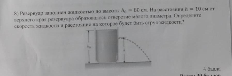 Резервуар заполнен жидкостью до высоты ho = 80 см. На расстоянии h = 10 см от верхнего края резервуара образовалось отверстие малого диаметра. Определите скорость жидкости и расстояние на которое будет бить струя жидкости?