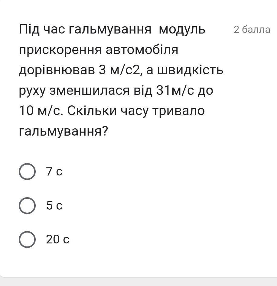 Під час гальмування модуль прискорення автомобіля дорівнював 3 м/с2, а швидкість руху зменшилася від 31м/с до 10 м/с. Скільки часу тривало гальмування?