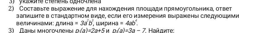 составьте задачу для нахождения площади прямоугольника ответ запишите в стандартном виде если его измерения выражены следующими величинами: длина 3a²b³, ширина 4ab⁴