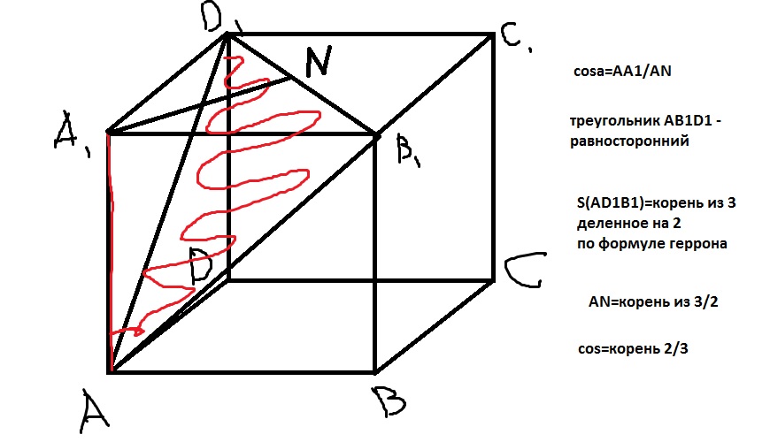 угол не зависит от величины сторон. Куб есть куб, в каких бы размеров он ни был, косинус угла не изменится, поэтому будем считать что куб единичный