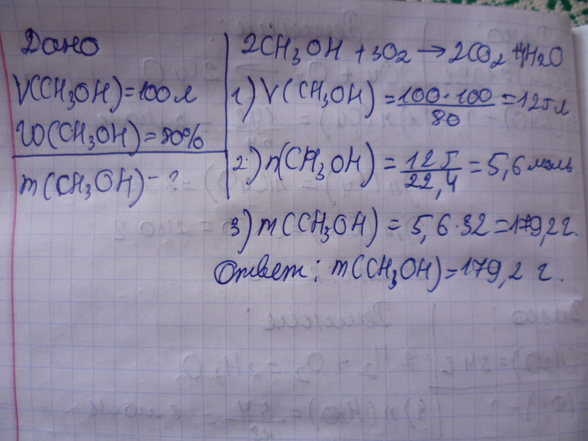 Вычислите сколько граммов метанола можно получить, сжигая (или восстанавливая) 100 л метанола, содержащего 20% примесей.