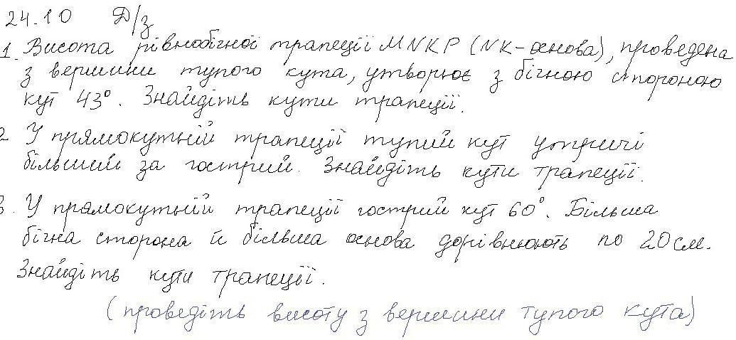 В равнобокий трапеции равны тупые углы при меньшем основании и острые углы при бОльшем основании.Сумма углов,прилегающих к каждой боковой стороне равна 180*