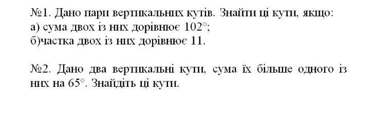 даю 55 балів 7 клас N1. Дано пари вертикальних кутів. Знайти ці кути, якщо: а) сума двох із них дорівнює 102°; б)частка двох із них дорівнює 11. (на любом языке можно желательно на українській мові)