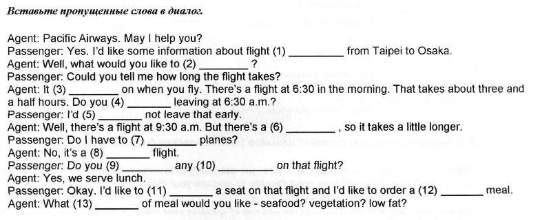 shedules (летит по расписанию), depend, kind, special, reserve (зарезервировать), mind, rather, change, stopover (транзитная остановка), direct (прямой), serve (предоставлять), meals, know (12)