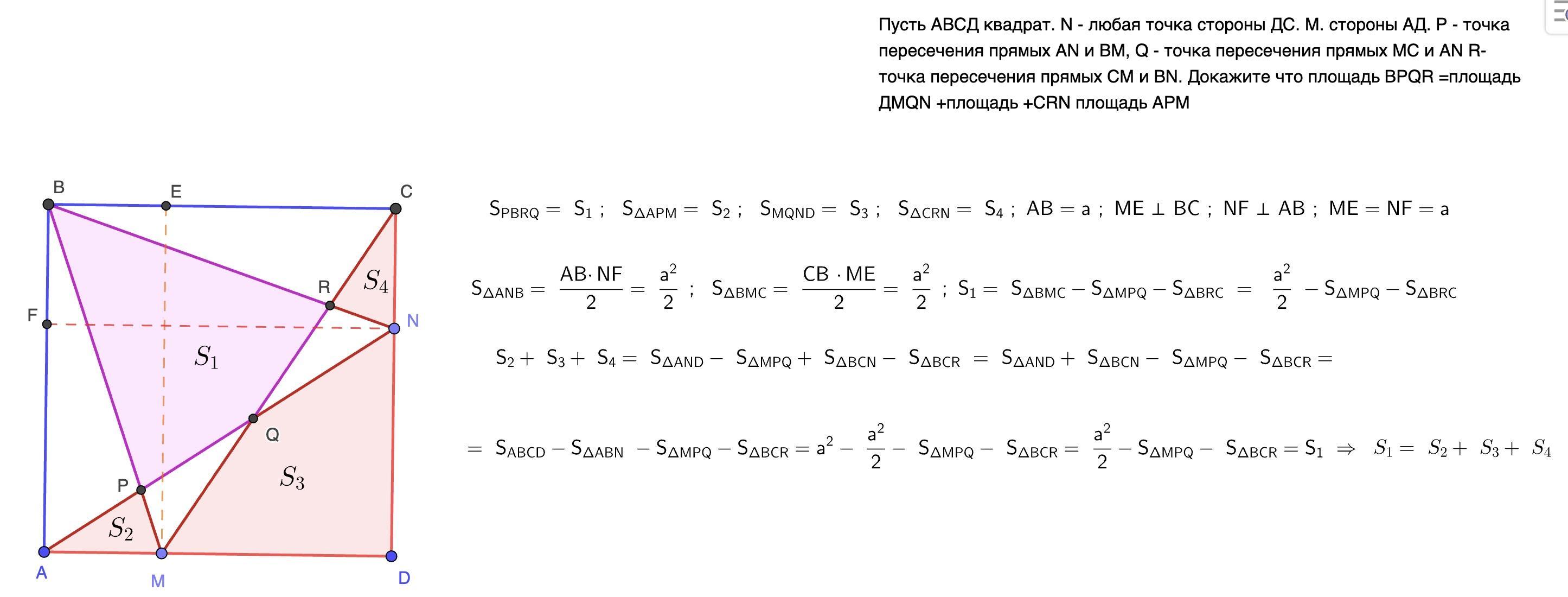 Пусть АВСД квадрат. N - любая точка стороны ДС. М. стороны АД. Р - точка пересечения прямых AN и BM, Q - точка пересечения прямых МС и AN R- точка пересечения прямых СМ и ВN. Докажитe что площадь BPQR =площадь ДMQN +площадь +CRN площадь APM