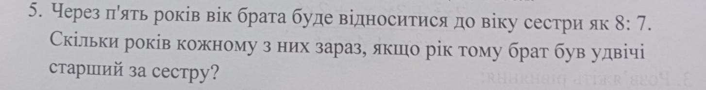 5. Через п'ять років вік брата буде відноситися до віку сестри як 8: 7. Скільки років кожному з них зараз, якщо рік тому брат був удвічі старший за сестру?