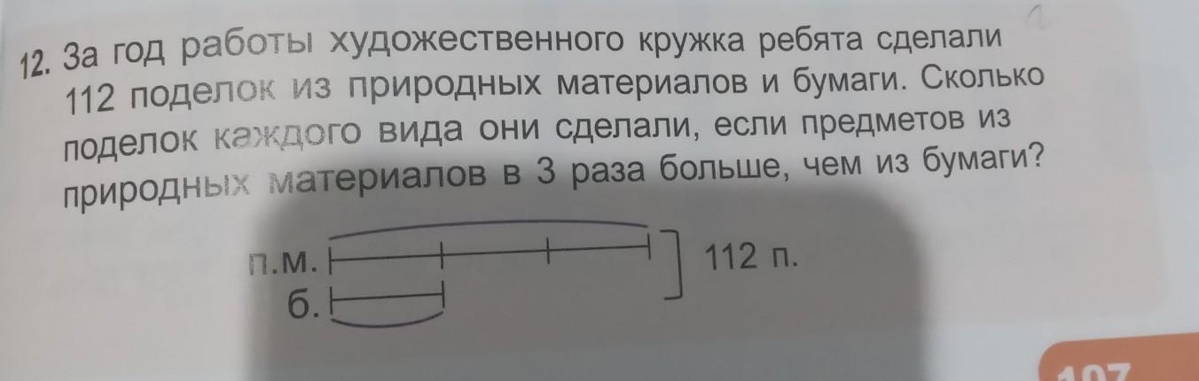 12. За год работы художественного кружка ребята сделали 112 поделок из природных материалов и бумаги. Сколько поделок каждого вида они сделали, если предметов из природных материалов в 3 раза больше, чем из бумаги? п.м. 6. 112 m. 10