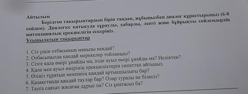 мину 10 балл Айтылым Берілген тақырыптардын бiрiн тандап, жұбынызбен диалог құрастырыныз (6-8 сөйлем). Диалогке катысуда сұраулы, хабарлы, лептi және буйрыкты сойлемдердін интонациялык ерекшелiгiн ескерiнiз. Ұсынылатын такырыптар 1. Сiз ушін отбасынын манызы кандай? 2. Отбасынызда кандай мерекелер тойланады? 3. Сiзге кала емiрi унайды ма, әлде ауыл емiрi унайды ма? Неліктен? 4. Кала мен ауыл омiрiнiн ерекшеліктерін сипаттап айтыныз. 5. Өзiнiз тұратын мекеннiн кандай артыкшылыгы бар? 6. Казакстанда кандай таулар бар? Олар туралы не білесіз? 7. Тауға саяхат жасаган дұрыс па? Сiз ұнатасыз ба? даю 40 балов срочноооооооооо