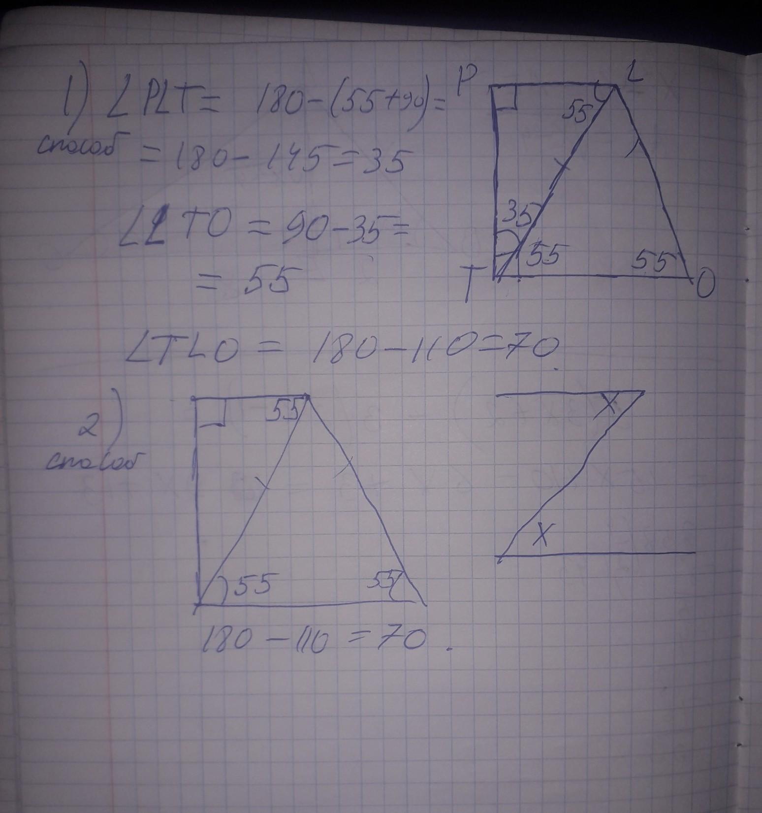 55°×2= 110°( 55 множим на 2 сторони бо кут TLO рівнобедрений)