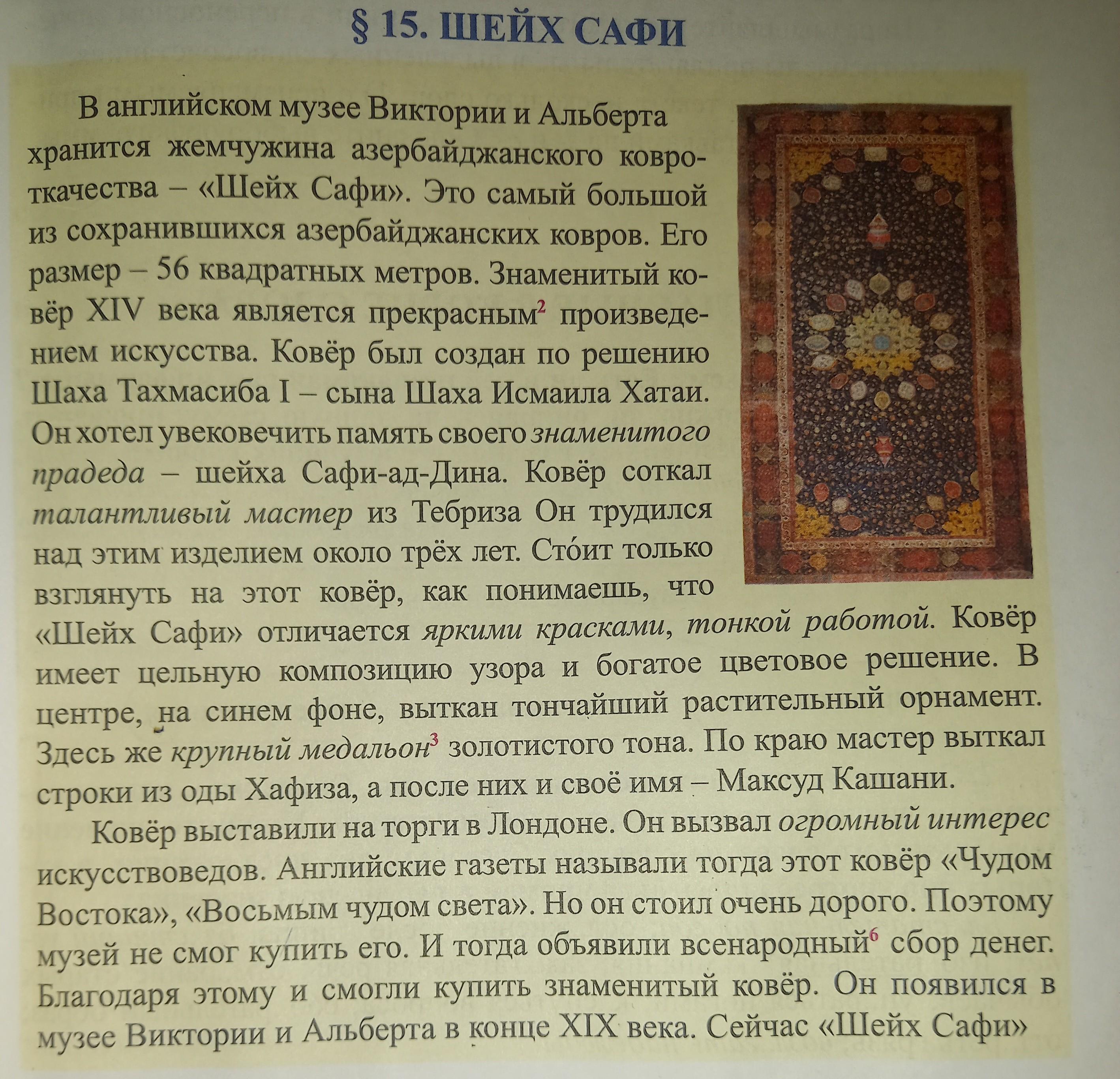 Прочитайте текст. Как бы вы озаглавили его? 2. Определите тип и тему текста. 3. Найдите в тексте сравнения. Обоснуйте свой выбор. 4. С помощью каких эпитетов автор описывает красоту ковра? 5. Почему азербайджанский ковёр назвали «восьмым чудом светам 6. Испытываете ли вы чувство гордости за творение мастера Расскажите о своих впечатлениях от прочитанного текста. 7. Как вы понимаете выражения: жемчужина ковроткачество ыставили на торги, всенародный сбор денег? 8. Поразмышляйте и скажите, в прямом или в переносном знача ии употреблены прилагательные в выделенных словосочетаниях. 9. Выпишите из текста несколько слов: 1) с неизменяемыми при -авками; 2) с приставками на з- и с-. Объясните выбор орфограммы.