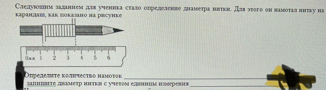 На карандаш намотано 12 витков нитки. Начало измерения намотки равно 12мм, окончание намотки равно 36мм