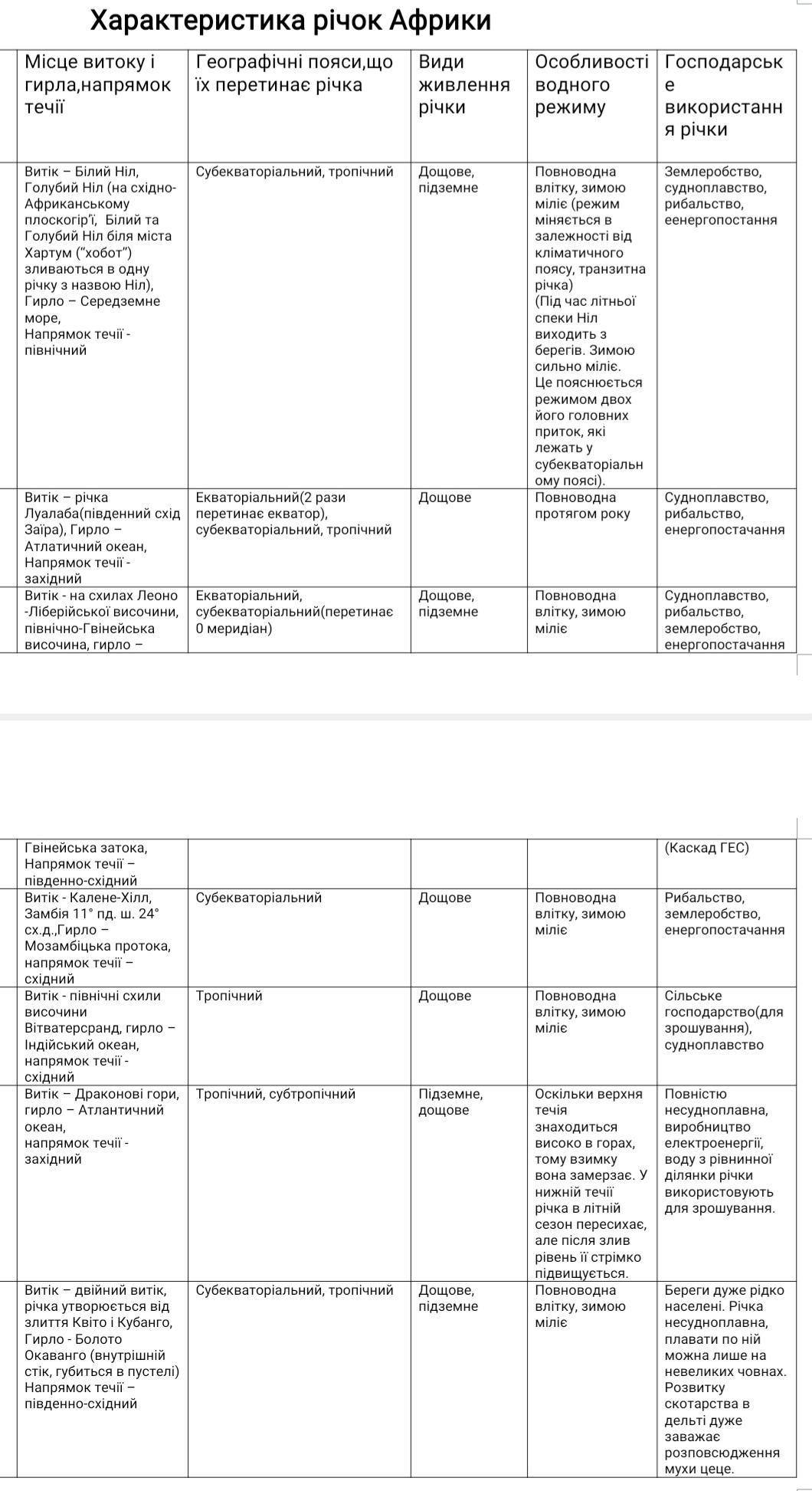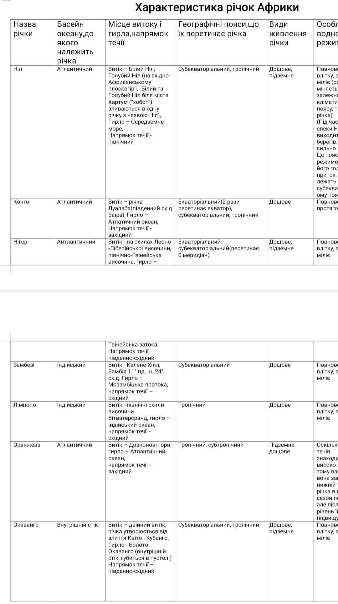 Підготувати характеристику рік Африки за планом. 1. Назва річки, її походження. 2. Басейн океану до якого належить річка. 3. Місце витоку і ( рівнинна, гірська) i 4. Наявність порогів, водоспадів. 5. Основні притоки річки. 6. Географічні пояси, що іх перетинає річка. гирла, напрям течії, характер течії 7. Види живлення річки. 8. Господарське використання річки.