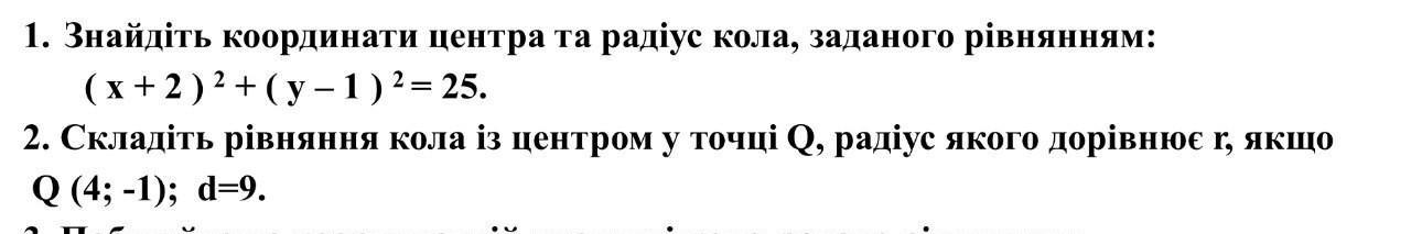 1. Знайдіть координати центра та радіус кола, заданого рівнянням: (x+2) 2+(y-1) 2= 25.