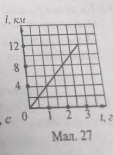 На малюнку 27 зображено графік залежності шляху від часу для рівномірного руху туриста. Використовуючи графік, визначити шлях, який пройде турист за 1,5 год. За який час він пройде 10 км? Яка його швидкість руху? Який шлях пройде турист за 5 год, рухаючись з незмінною швидкістю?